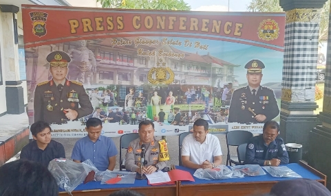 Kapolres Gianyar AKBP Ketut Widiada, didampingi Kasat Reskrim Polres Gianyar AKP Ario Seno Wimoko, Kasi Humas Polres Gianyar Iptu I Nyoman Tantra serta penyidik menggelar jumpa pers di Lobby Mapolres Gianyar, Selasa (26/9/2023).