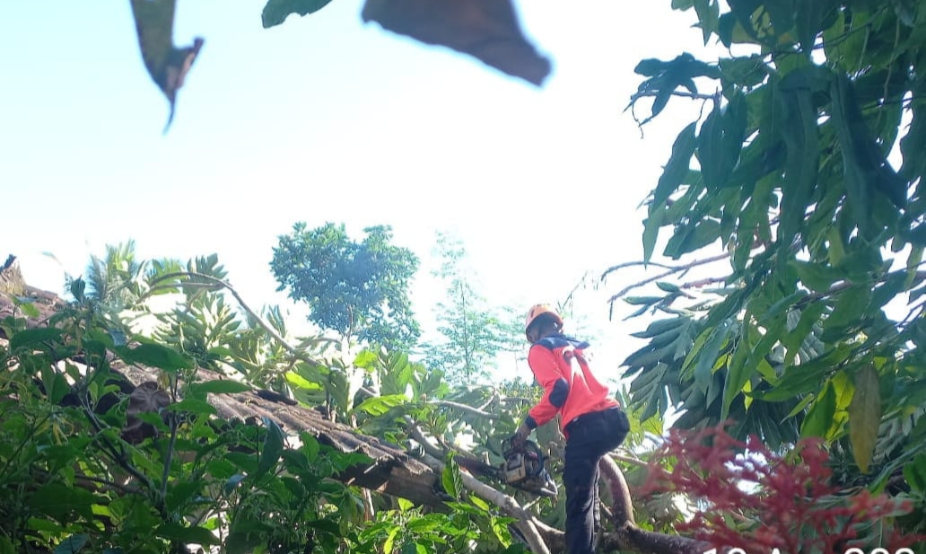 Petugas BPBD melakukan pembersihan dahan pohon yang menimpa rumah korban Jumat (19/4/24). Akibat kejadian tersebut korban ditaksir mengalami kerugian sebesar 20 juta rupiah.