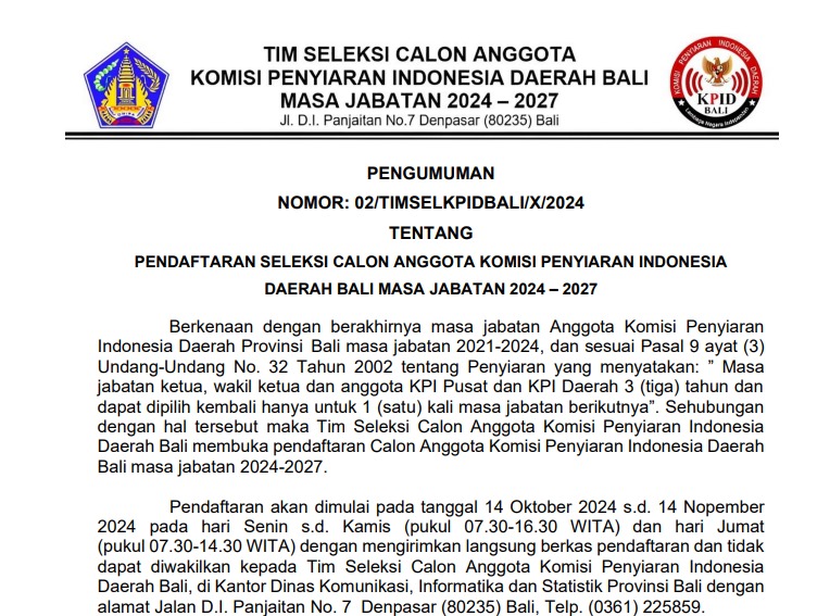 Denpasar – Dinas Komunikasi, Informatika, dan Statistik (Diskominfos) Provinsi Bali membuka pendaftaran Calon Anggota Komisi Penyiaran Indonesia Daerah (KPID) Bali masa jabatan 2024-2027.