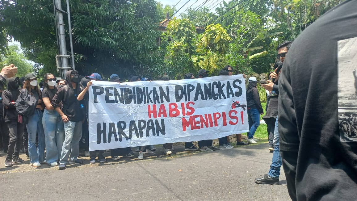 Dari pantauan Wacanabali.com, massa mulai memadati lokasi sejak pukul 11.30 WITA. Beberapa di antaranya membawa spanduk bertuliskan “Pendidikan Dipangkas Habis, Harapan Menipis”, “Indonesia Gelap Darurat Pendidikan”, dan ungkapan serupa lainnya.