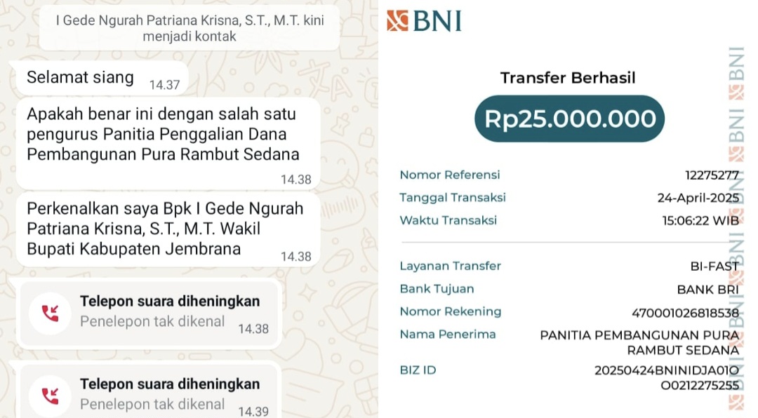 Ketua Panitia Penggalangan Dana Pura Rambut Sedana, I Dewa Sugita, membenarkan hampir menjadi korban penipuan berkedok donasi dengan mengatasnamakan Wakil Bupati Jembrana.