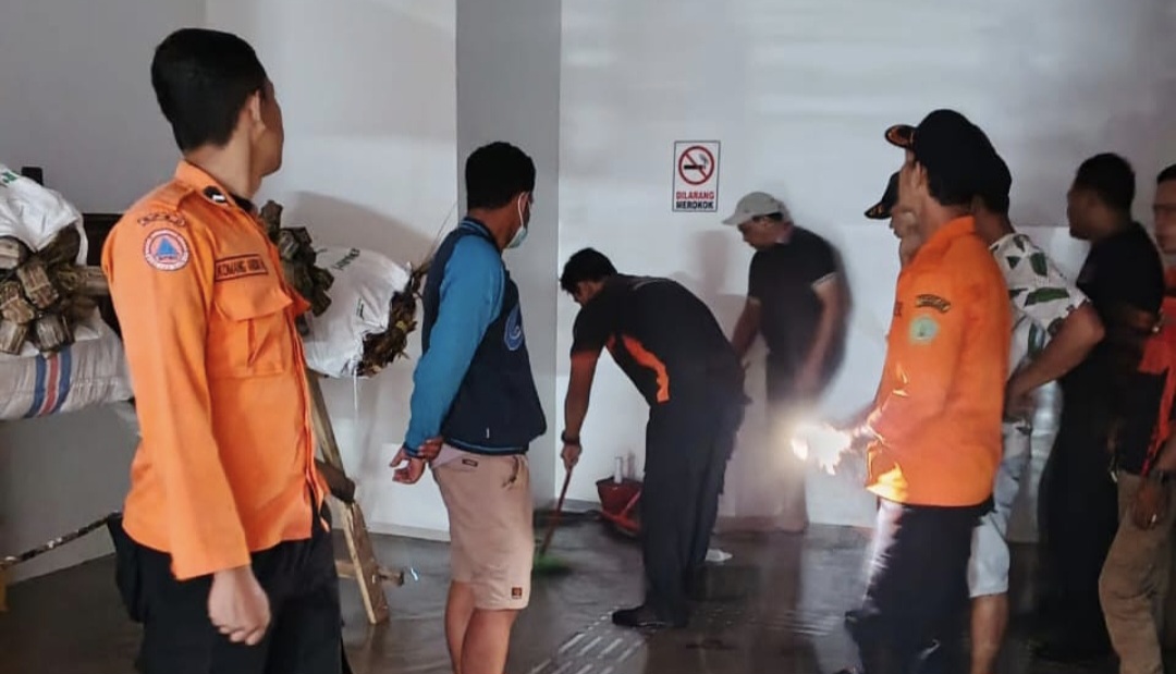 Petugas Badan Penanggulangan Bencana Daerah (BPBD) Kabupaten Jembrana yang datang kelokasi kesulitan menyedot air. Upaya pembersihan air dilakukan secara manual oleh para pedagang, petugas pasar dan personel BPBD.