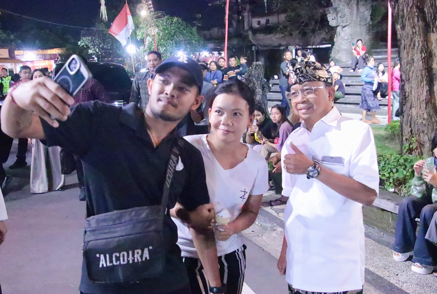 Tak butuh panggung mewah atau pengeras suara bagi Koster untuk menyatu dengan masyarakat. Ia berjalan perlahan, menyapa satu per satu pengunjung, dari anak-anak hingga lansia, dari seniman cilik hingga pengunjung dari luar pulau seperti Lampung. Bahkan, ia tampak merunduk agar sejajar dengan anak-anak yang ingin berswafoto, sambil memberikan pesan menyentuh: “Semangat ya, terus berkarya dan jaga tradisi Bali,” ucap Gubernur lirih.