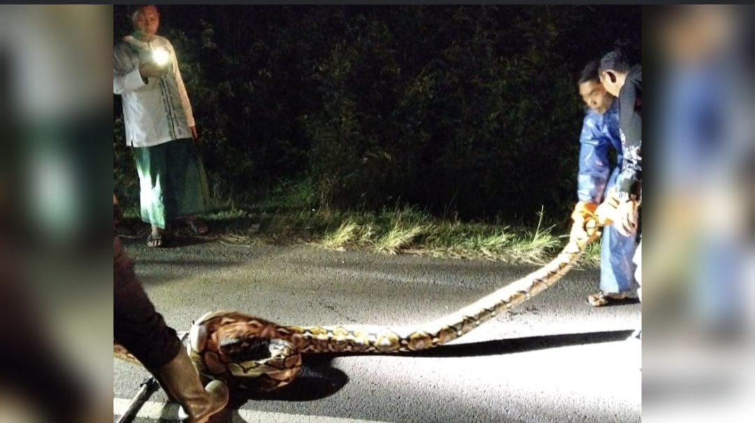 Melintang di Jalan, Damkar Jembrana Evakuasi Ular Sanca Sepanjang 5 Meter