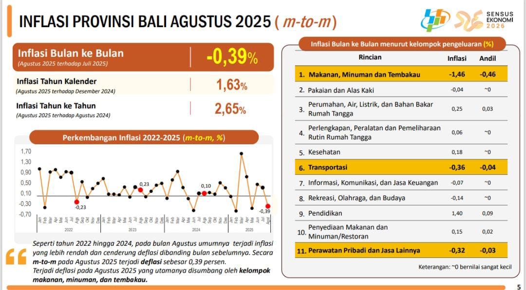 Denpasar – Bali mencatat deflasi sebesar 0,39 persen pada Agustus 2025.