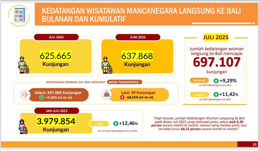 Denpasar – Badan Pusat Statistik (BPS) Provinsi Bali mencatat kunjungan wisatawan mancanegara (wisman) ke Bali pada Juli 2025 mencapai 697,11 ribu kunjungan.
