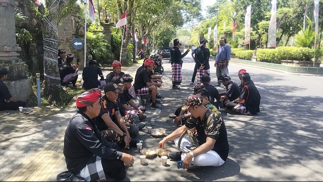 Puluhan pacalang dari Pasikian Pacalang Kabupaten Jembrana berjaga di sekitar Kantor DPRD Jembrana. Sebagian besar pacalang duduk di depan kantor, berbaur dengan aparat TNI Polri dan Banser.