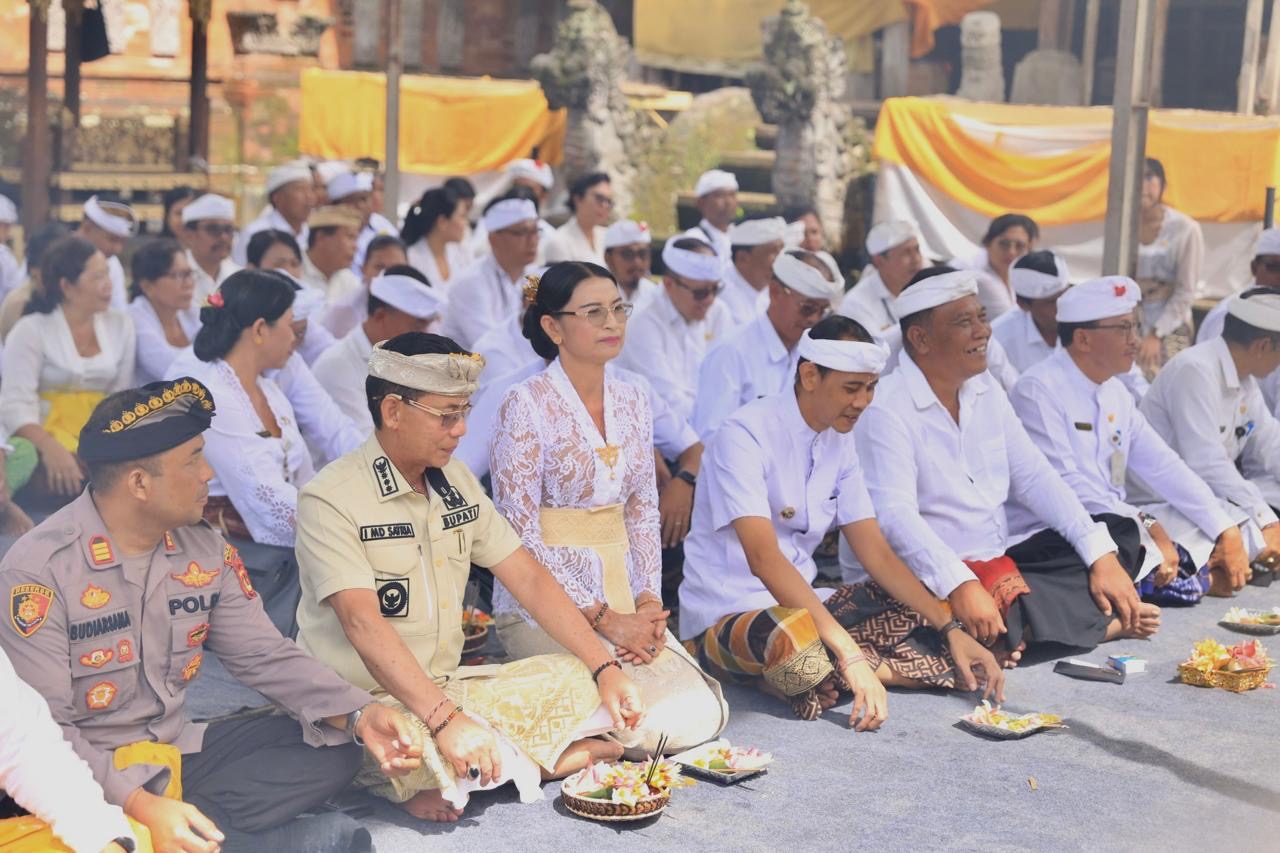 Klungkung – Bertepatan dengan rahina Buda Kliwon, Bupati Klungkung, I Made Satria bersama Wakil Bupati Klungkung, Tjokorda Gde Surya Putra dan Ketua TP. PKK Kabupaten Klungkung, Ny. Eva Satria muspayang bakti serangkaian Dimulainya Pelaksanaan Haluan Pembangunan Bali Masa Depan, 100 Tahun Bali Era Baru 2025-2125 Periode 2025-2030 di Pura Agung Kentel Gumi, Desa Tusan, Kecamatan Banjarangkan, Kabupaten Klungkung, Rabu (24/12). Persembahyangan bersama jajaran Organisasi Perangkat Daerah (OPD) berjalan hikmat dipuput Jero Mangku Pura setempat. Turut hadir Ketua DPRD Kabupaten Klungkung, Anak Agung Gde Anom