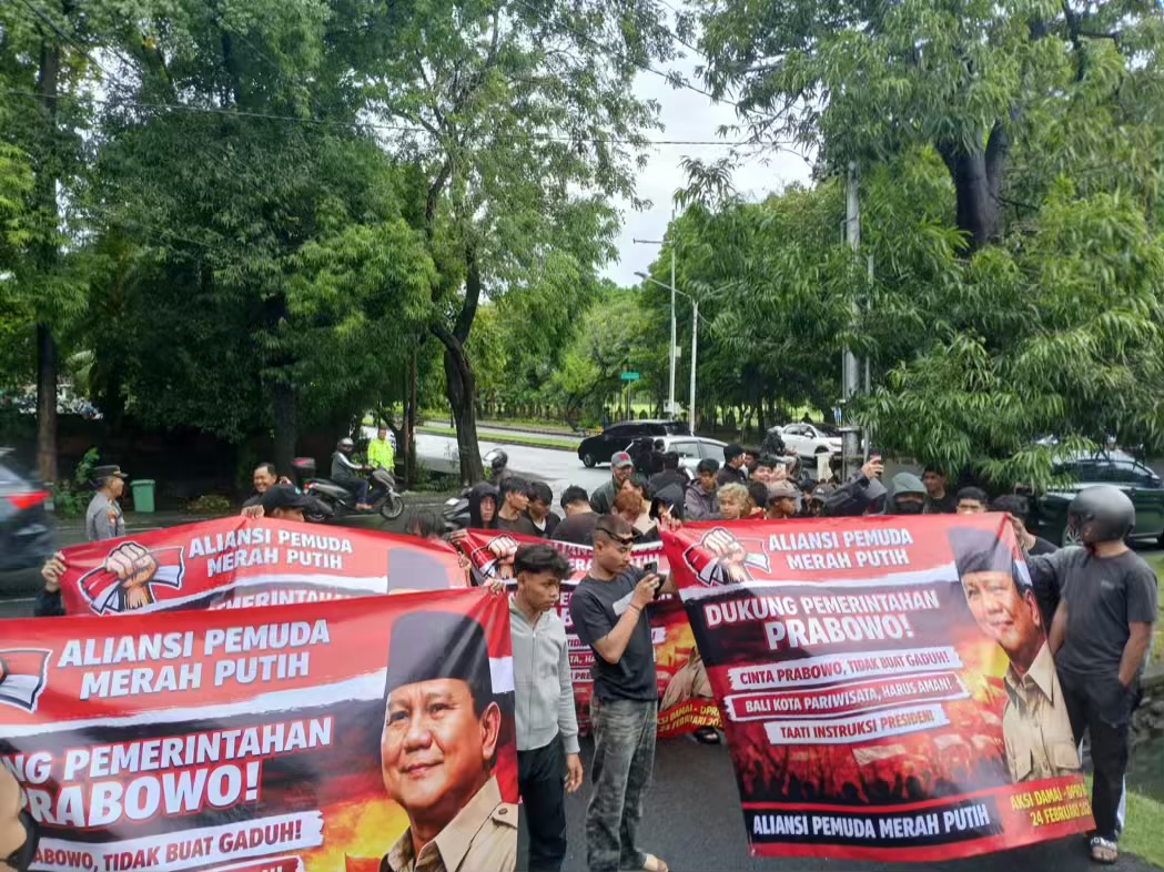 Awalnya masa aksi bergerak dari depan Kantor Cabang Bank BRI Renon sembari membawa spanduk bertuliskan “dukung pemerintahan Prabowo”.