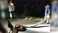 Jembrana - Ular Sanca atau phyton sepanjang 5 meter lebih dengan berat sekitar 33 kilogram berhasil...