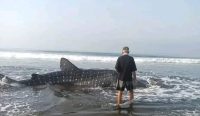 Jembrana - Hiu paus dengan ukuran besar ditemukan mati terdampar di Pantai Banjar Yehkuning, Desa...